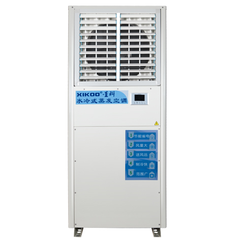 首先由外機(jī)采用濕簾蒸發(fā)式冷凝的技術(shù)來(lái)給循環(huán)水降溫,水溫降至常溫后流經(jīng)內(nèi)機(jī)的熱交換系統(tǒng)(此時(shí)壓縮機(jī)已運(yùn)作,已將冷媒壓縮成高溫高壓狀態(tài))從而帶走大部分高溫冷媒的熱量而形成常溫冷媒,常溫冷媒再經(jīng)過(guò)節(jié)流閥后變成低溫低壓的冷媒,輸送至內(nèi)機(jī)上半部分的蒸發(fā)器而吹出冷風(fēng);